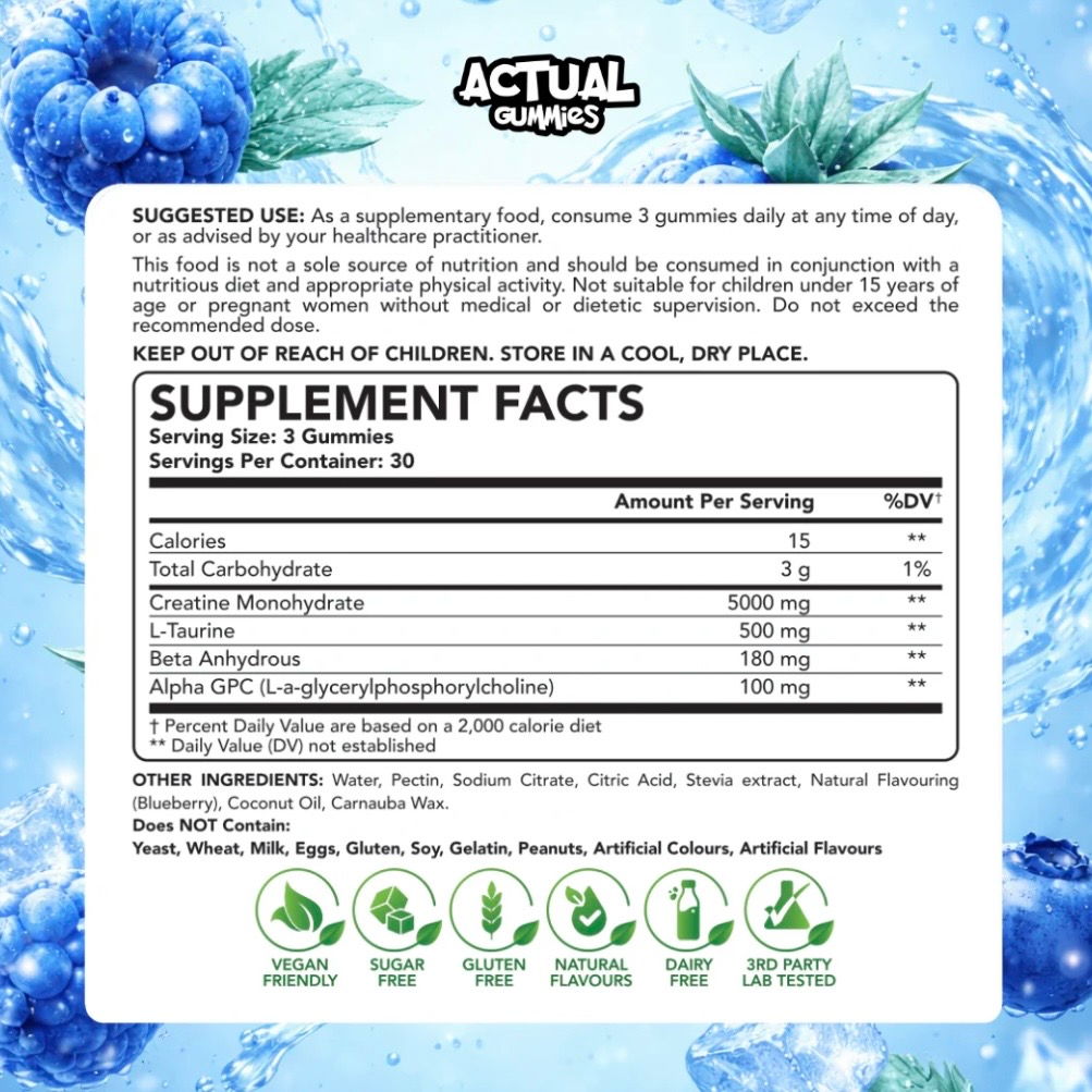 Each serving contains 3 gummies delivering 5g of creatine monohydrate, (the gold-standard form of creatine). With only 15 calories per serve. Creatine is one of the most researched supplements available and is proven to support muscle growth, strength, energy, endurance, recovery and mental focus. – whether you’re training hard or just staying active 💪⚡🧠